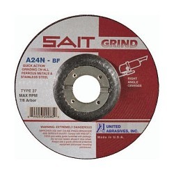 UA® Grinding Wheel, Type 27, 3 in Wheel Dia, 1/4 in Wheel Thickness, 3/8 in Center Hole, 24 Grit, Aluminum Oxide Abrasive, Series: A24N, Arbor Connector, Very Coarse Grade, 18000 rpm Maximum, Applicable Materials: Ferrous Metals (Iron, Steel, Welds, Etc.), Low Grade Stainless Steel, Yes Reinforced